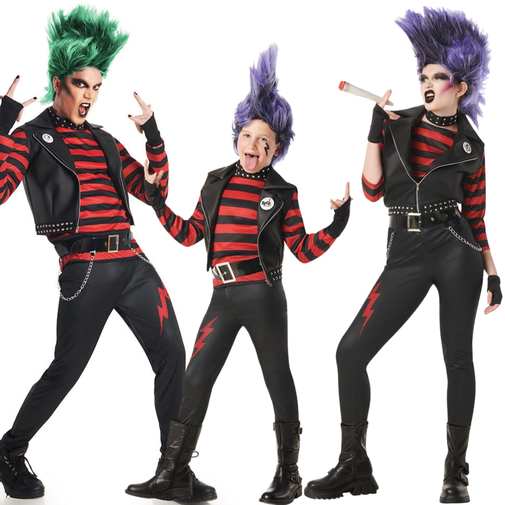 Punkrockers mit Streifen Gruppenkostüme für Fasching und Mottopartys. Wähle die Größen und Mengen, die du benötigst, um dich in Gruppe oder in Familie zu verkleiden und du wirst mit unseren besten Ideen hervorstechen.