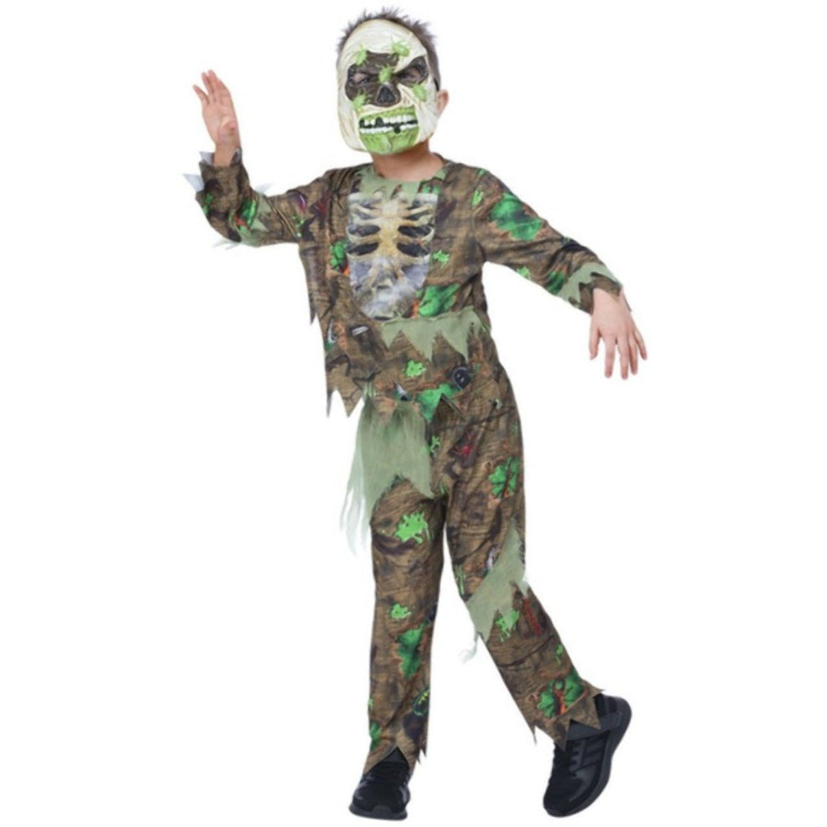 Skelett-Zombie-Kostüm für Kinder für Halloween- und Karnevalspartys. Kriechen Sie durch die schrecklichsten Partys, die als lebende Tote bezeichnet werden. Entscheiden Sie sich dafür, sich auf Ihren Halloween-Partys als Zombie zu verkleiden, und Sie werden es mit Sicherheit richtig machen. Ein gutes Make-up tut sein Übriges, sodass Sie nicht wiederzuerkennen sind.
